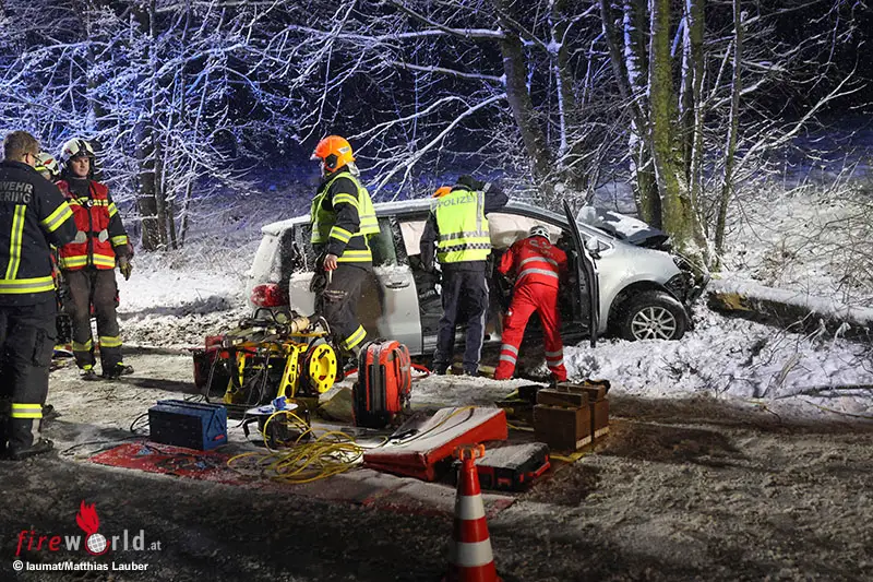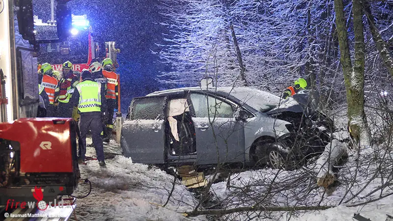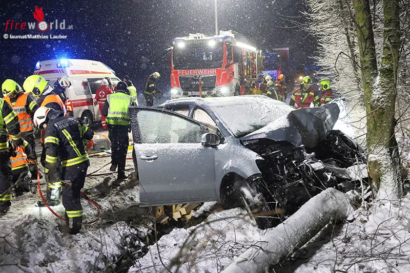 Die Einsatzkräfte von drei Feuerwehren, Rettung, Notarzt und Polizei wurden Freitagfrüh auf die L1388 Ruflinger Straße, Hitzinger Straße, ins Gemeindegebiet von Wilhering alarmiert. Ein Auto ist dort bei winterlichen Straßenverhältnissen offensichtlich links von der Fahrbahn abgekommen und frontal gegen einen Baum gekracht.