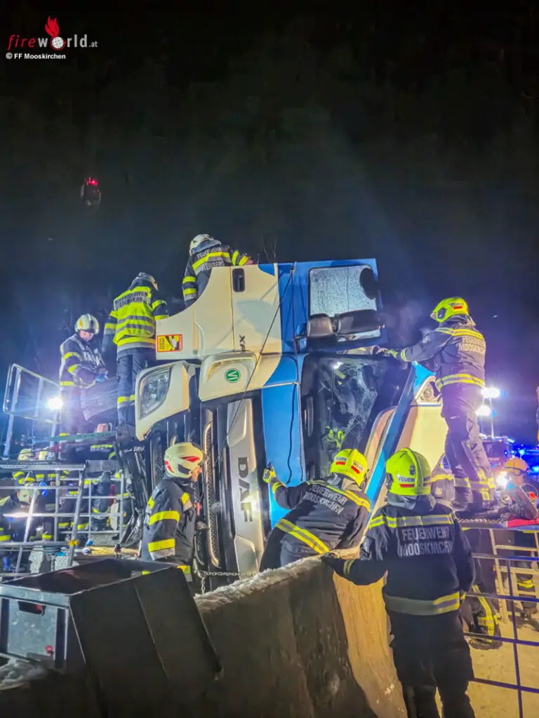 Stmk: Lenker in auf A 2 bei Mooskirchen umgestürzten Sattelschlepper eingeklemmt → schwieriger Rettungseinsatz