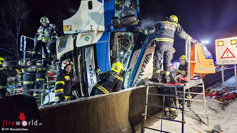 Umgehend wurde mit der Menschenrettung des Lkw-Lenkers begonnen. Innere Retter der Feuerwehr stiegen zu dem verletzen Fahrer in die Kabine ein und begannen mit der Erstversorgung. Zeitgleich wurde eine Rettungsplan erarbeitet. Von der Einsatzleitung wurde die Feuerwehr Lieboch mit dem Kranfahrzeug und Seilwinde als Verstärkung nachalarmiert.