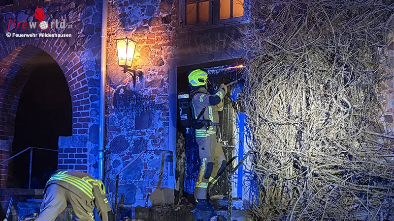 WILDESHAUSEN (DEUTSCHLAND): In der Nacht auf Mittwoch, 25. Februar 2026, wurde die Feuerwehr Wildeshausen um 00:46 Uhr mit dem Alarmstichwort F2 – Gemeindehaus brennt – in die Straße Sägekuhle alarmiert. Das Stichwort F2 steht dabei für einen Gebäudebrand mit entsprechendem, erweiterten Kräfteansatz.