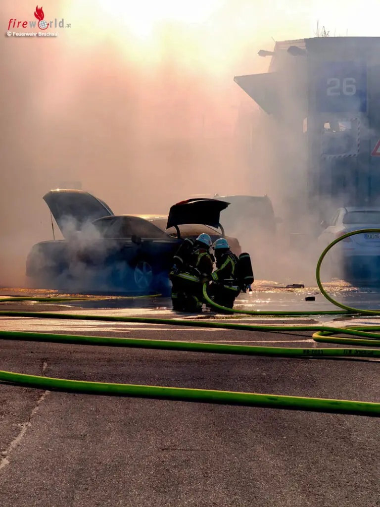Eine starke Rauchentwicklung war weithin sichtbar. Unter Atemschutz wurde mit einem C-Rohr zunächst eine Riegelstellung zur Halle aufgebaut und das brennende Fahrzeug massiv abgelöscht. Der Brand flammte jedoch in den Akkuzellen immer wieder auf.