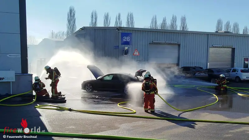 BRUCHSAL (DEUTSCHLAND): Zu einem Brand eines E-Fahrzeuges an einem Gebäude in der Ernst-Blickle-Straße wurde die Feuerwehr Bruchsal am Mittwochnachmittag, 25. Februar 2026, um 13:43 Uhr alarmiert. An einer Halle stand ein E-Fahrzeug, das im Bereich des Akkus Feuer gefangen hatte.