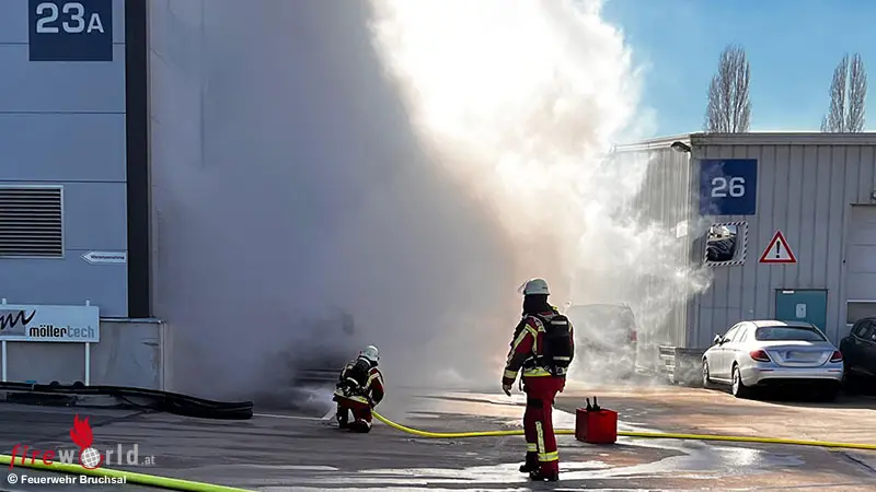 BRUCHSAL (DEUTSCHLAND): Zu einem Brand eines E-Fahrzeuges an einem Gebäude in der Ernst-Blickle-Straße wurde die Feuerwehr Bruchsal am Mittwochnachmittag, 25. Februar 2026, um 13:43 Uhr alarmiert. An einer Halle stand ein E-Fahrzeug, das im Bereich des Akkus Feuer gefangen hatte.