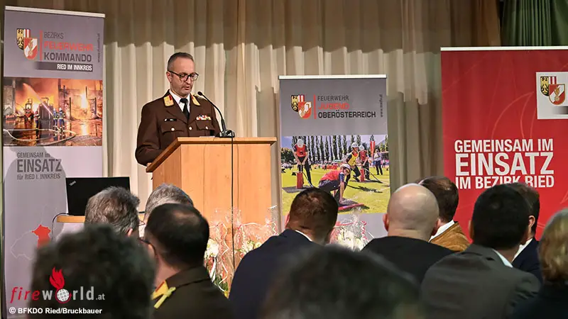 RIED IM INNKREIS (OÖ): Eine beeindruckende Leistungsbilanz zog Bezirks-Feuerwehrkommandant Jürgen Hell beim Bezirks-Feuerwehrtag 2026 am Donnerstag, 5. März 2026. Zahlreiche Ehrengäste aus Politik, Wirtschaft, Behörden und Blaulichtorganisationen sowie Feuerwehren und Funktionären des Bezirkes waren dazu der Einladung in die Rieder Bauernmarkthalle gefolgt. Besonders die Anwesenheit von Landeshauptmann Thomas Stelzer sowie Landes-Feuerwehrkommandant und Feuerwehrpräsident Robert Mayer unterstrich die Verbundenheit zum Feuerwehrwesen im Bezirk Ried im Innkreis.