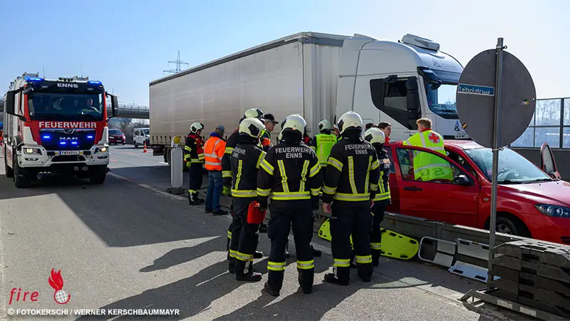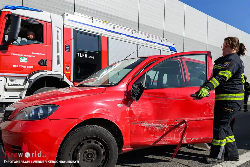 Die Feuerwehr Enns wurde um 11:45 Uhr zu einer Personenrettung alarmiert. Beim Eintreffen der Einsatzkräfte stellte sich heraus, dass die Lenkerin des Pkw ihr Fahrzeug bereits eigenständig verlassen konnte. Sie wurde vom Rettungsdienst erstversorgt und zur Kontrolle in ein Krankenhaus nach Linz gebracht.