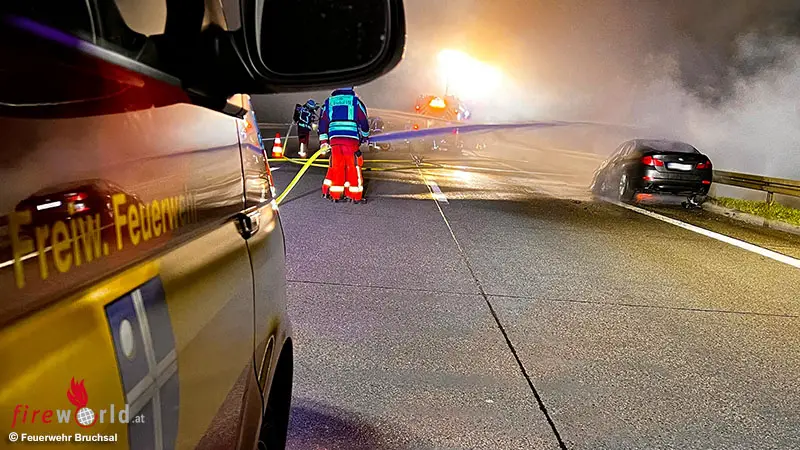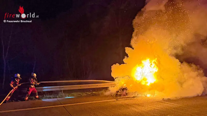 BRUCHSAL (DEUTSCHLAND): Zu einem Pkw-Brand auf der BAB 5 in Fahrtrichtung Karlsruhe wurde die Feuerwehr Bruchsal am Samstagabend, 7. März 2026, um 21:20 Uhr mit den Abteilungen Untergrombach und Bruchsal alarmiert.