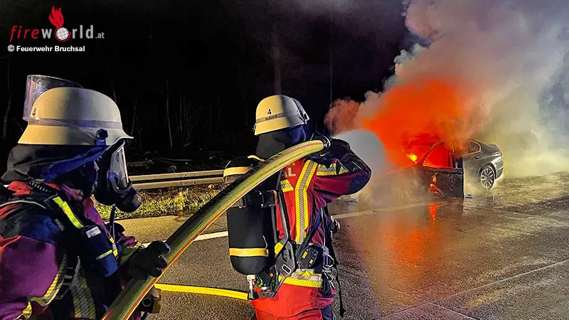 BRUCHSAL (DEUTSCHLAND): Zu einem Pkw-Brand auf der BAB 5 in Fahrtrichtung Karlsruhe wurde die Feuerwehr Bruchsal am Samstagabend, 7. März 2026, um 21:20 Uhr mit den Abteilungen Untergrombach und Bruchsal alarmiert.