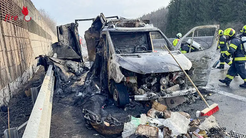 Einsatzleiter Robert Schönberger von der Feuerwehr St. Georgen berichtete: „Innerhalb kürzester Zeit stand der Kleintransporter in Vollbrand, bereits bei unserer Anfahrt waren die dichten Rauchschwaden weithin sichtbar!“