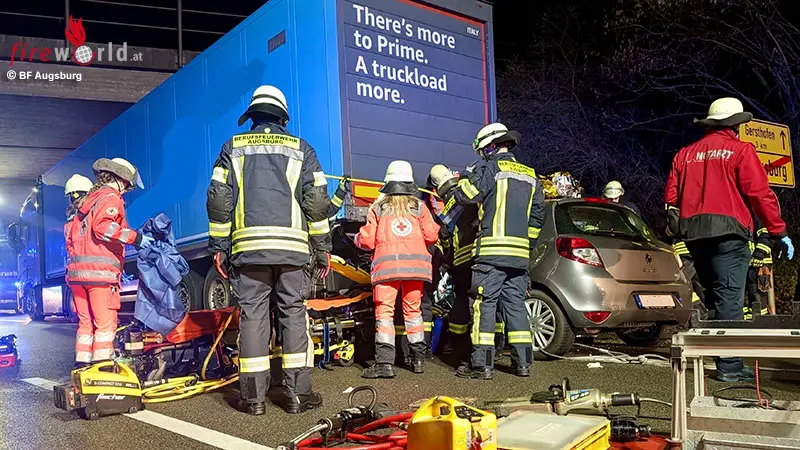 Bayern: Schwer eingeklemmte Person nach Pkw-Auffahrunfall auf Sattelschlepper bei Augsburg