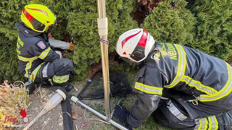 Da das Tier den Garten nicht mehr selbstständig verlassen konnte, entschloss sie sich, die Feuerwehr um Hilfe zu verständigen. Die ausgerückten Einsatzkräfte konnten den geschwächten Vogel rasch und behutsam einfangen.