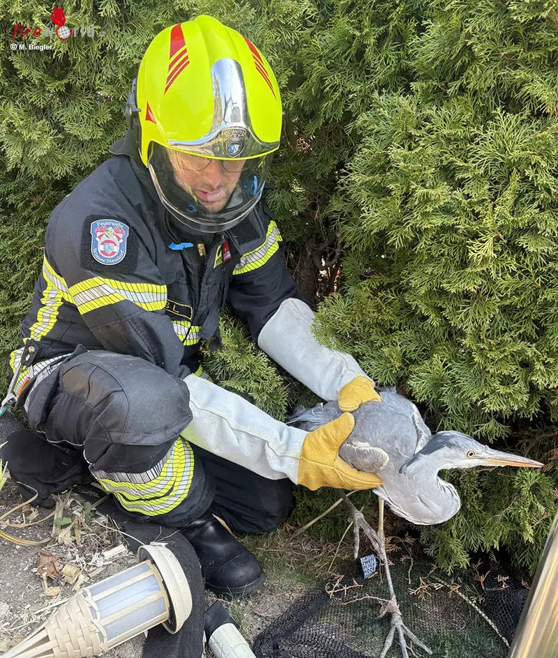 WIENER NEUDORF (NÖ): Am 12. März 2026 wurde die Freiwillige Feuerwehr Wiener Neudorf zu einer Tierrettung alarmiert. Eine Wiener Neudorferin hatte bereits seit rund einem Tag einen Reiher in ihrem Garten beobachtet, der offenbar verletzt und stark geschwächt war.