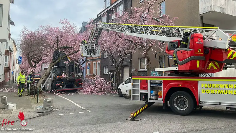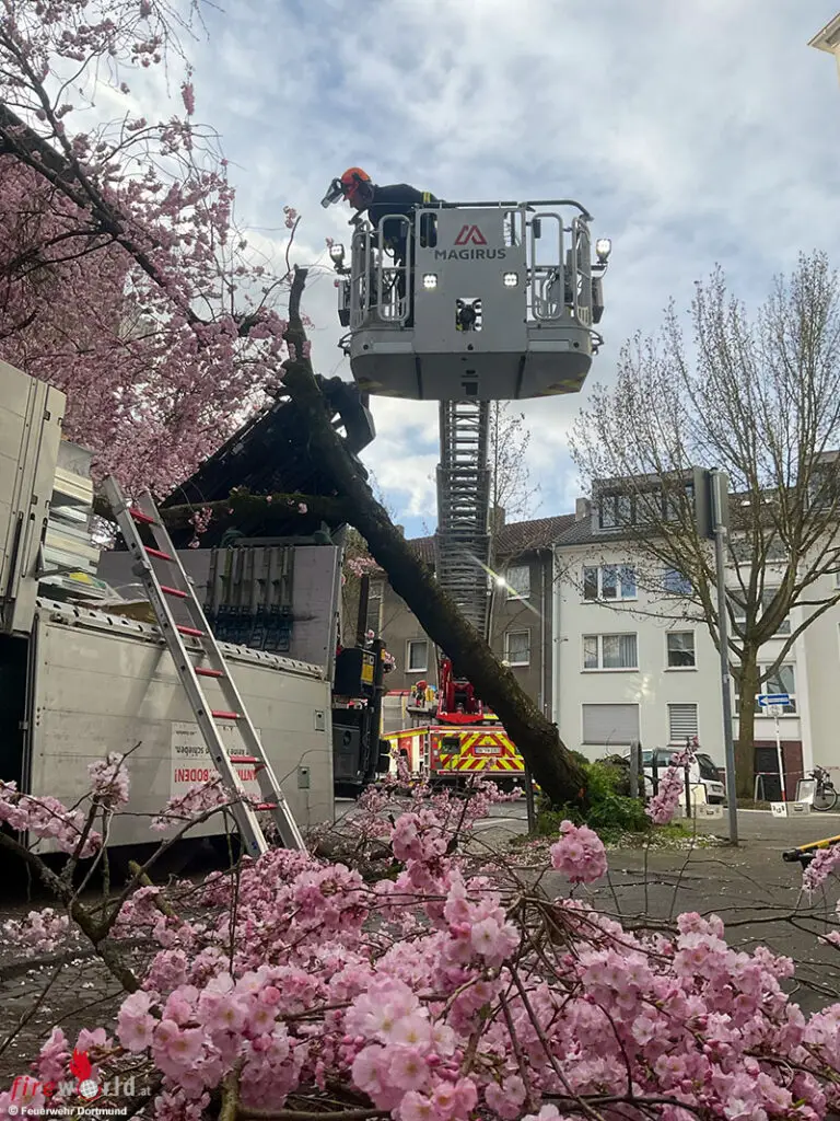 DORTMUND (DEUTSCHLAND): Am Vormittag des 13. März 2026 befuhr in Dortmund ein Lkw mit einem Kranaufbau im Heckbereich die Moltkestraße und blieb dabei mit dem Kranausleger an einem Baum hängen.