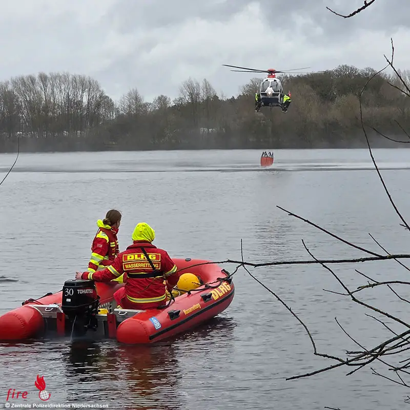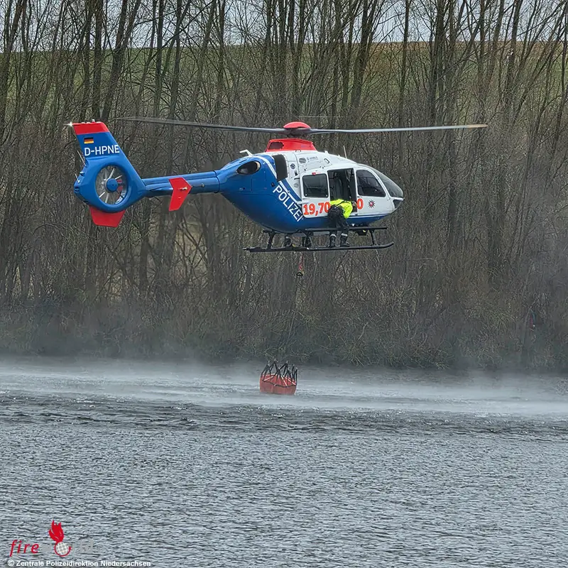 Im Mittelpunkt stand das Training der Hubschrauberstaffel der Polizei Niedersachsen im Umgang mit sogenannten „Bambi-Buckets“. Dabei übten die Piloten wiederholt die präzise Wasseraufnahme sowie die Abgabe über ausgewiesenen Flächen. Dieses Verfahren kommt vor allem bei größeren Vegetations- und Waldbränden zum Einsatz, wenn Brandherde aus der Luft bekämpft werden müssen oder schwer zugängliche Bereiche betroffen sind.