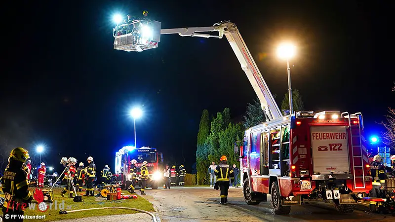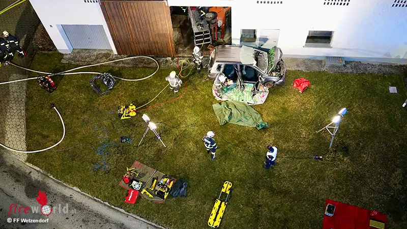 Unter der Einsatzleitung von HBI Florian Huber, FF Wetzendorf, wurde zunächst eine Totalsperre der Straße zwischen Wetzendorf und der Abzweigung Richtung Geibing bei den Zeilberger Brücken eingerichtet. Die FF Wetzendorf begann umgehend mit der Menschenrettung beim außerhalb der Straße liegenden Fahrzeug. Parallel dazu errichteten die Feuerwehren Esternberg und Pyrawang eine Zubringleitung vom Dorferweiher und führten die Brandbekämpfung im Stadl unter schwerem Atemschutz durch. Die Feuerwehr Münzkirchen unterstützte die eingesetzten Atemschutztrupps und übernahm anschließend die Rettung der Personen aus dem zweiten Fahrzeug. Die Teleskopmastbühne der Feuerwehr Engelhartszell stand als zusätzliche Sicherungs- und Unterstützungseinheit bereit.