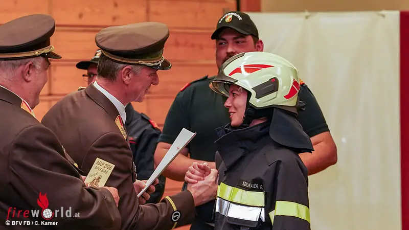Nach den Grußworten der Ehrengäste, die in ihren Ansprachen ebenso die Leistungen der Bewerber würdigten und dem Bewerterstab dankten, wurden mit HBI Philipp Stöckler von der FF Hof b. Straden und HLM d.F. Hannes Zangl von der FF Wiersdorf (beide BFV RA) zwei verdiente Bewerterkameraden mit der Bewerterspange in Silber ausgezeichnet. Danach erfolgte die Übergaben der Teilnehmer-Urkunden und Leistungsabzeichen an die Gruppenkommandanten der Trupps.