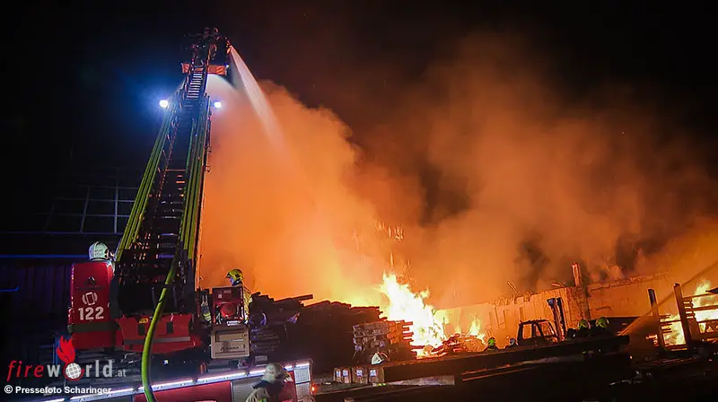 Gegen 23:54 Uhr wurde der Notruf wegen eines Feuers in einer Lagerhalle abgesetzt. Bereits beim Eintreffen der ersten Einsatzkräfte stand ein Großteil der Halle in Vollbrand. Die Brandlast war durch gelagertes Altholz besonders hoch, was zu einer raschen Ausbreitung der Flammen führte.