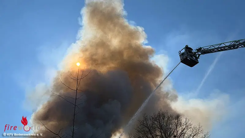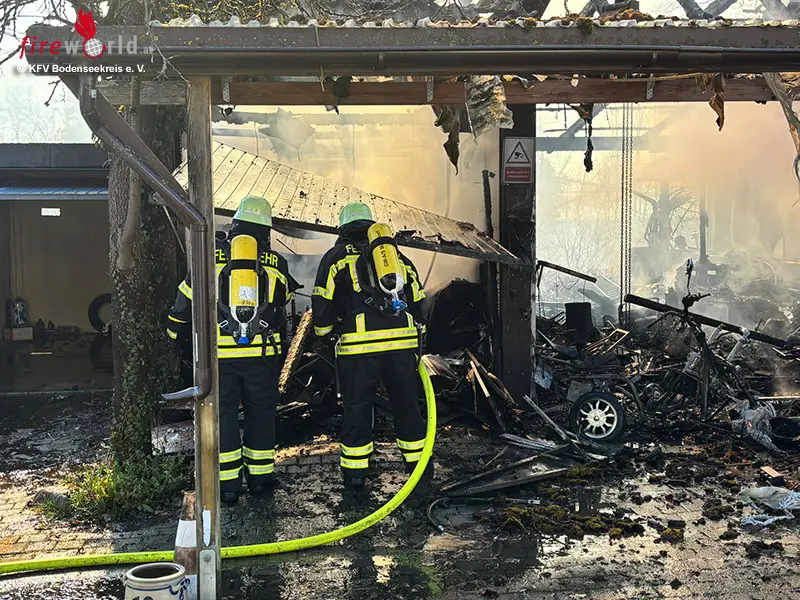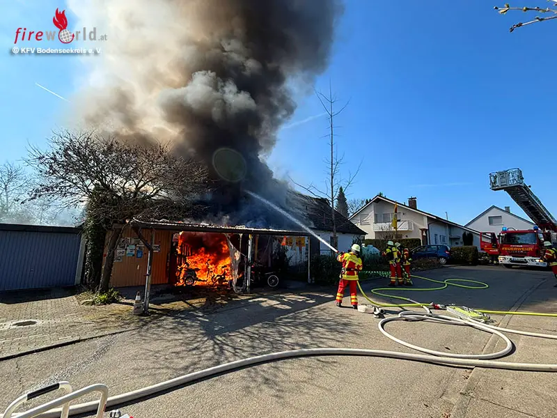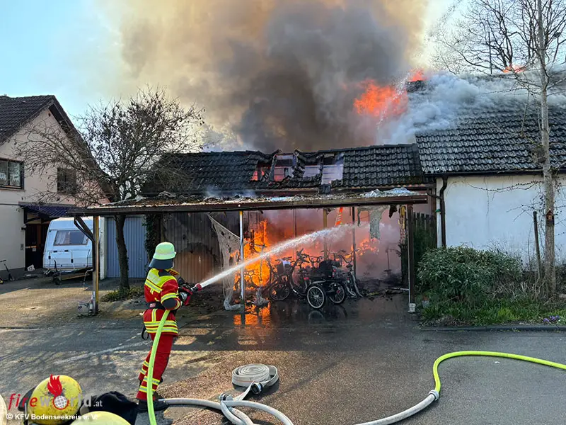 Schon auf der Anfahrt konnten die um 13.17 Uhr alarmierten Einsatzkräfte eine dichte schwarze Rauchwolke sehen und das Alarmstichwort erhöhen, um direkt weitere Kräfte hinzuzuziehen. Beim Eintreffen der Einsatzkräfte der Freiwilligen Feuerwehren Bermatingen und Markdorf stand der angebaute Carport- und Werkstattbereich mit zahlreichen Fahrrädern bereits im Vollbrand.