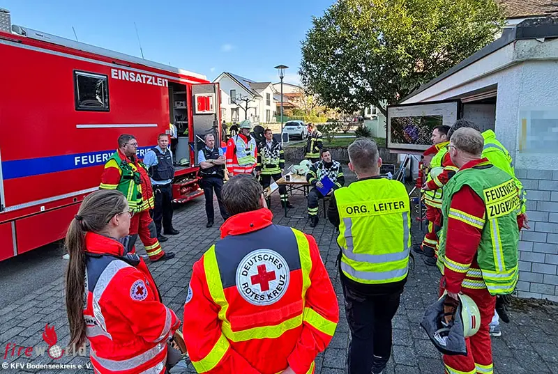 Zur Einsatzunterstützung war auch der große Einsatzleitwagen aus Friedrichshafen, der Gerätewagen Atemschutz-Strahlenschutz aus Markdorf und Löschfahrzeuge der umliegenden Wehren mit vor Ort. Starke Kräfte des Rettungsdienstes und Helfer der Einsatzgruppen der Bereitschaften (EgB) des DRK aus Markdorf und Immenstaad standen zur Absicherung und Versorgung der der Einsatzkräfte bereit.