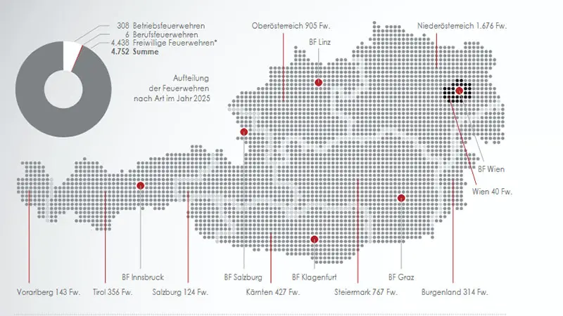 Die Anzahl der Feuerwehren steht in Österreich aktuell bei 4.752 (4.438 Freiwillige Feuerwehren inklusive zwei Freiwillige Feuerwehren an Universitäten, 308 Betriebsfeuerwehren, sechs Berufsfeuerwehren).