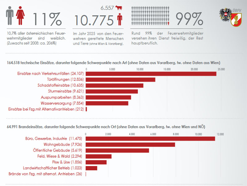 Besonders eindrucksvoll sind die Zahlen der geretteten Menschen und Tiere: Im Jahr 2025 wurden von den österreichischen Feuerwehren 10.775 Menschen und 6.557 Tiere gerettet (ohne Angaben aus Wien und Vorarlberg).