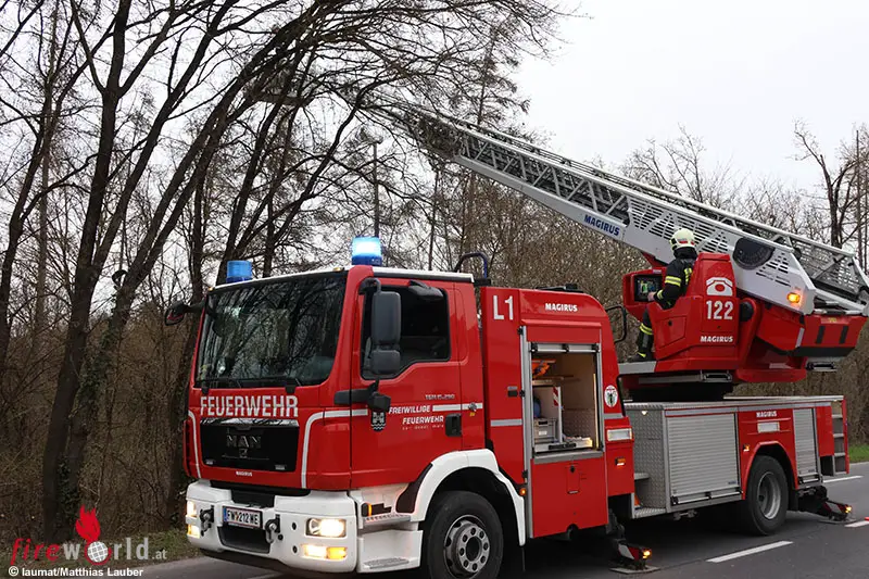Unmittelbar vor Eintreffen des prognostizierten Wettersturzes wurden die Einsatzkräfte der Feuerwehr zu einer Katze auf einem Baum in einem Park in Wels-Vogelweide alarmiert. Die Feuerwehr unternahm mehrere Versuche mittels Drehleiter den Standpunkt der Katze auf einem hohen, dünnen und morschen Baum zu erreichen.