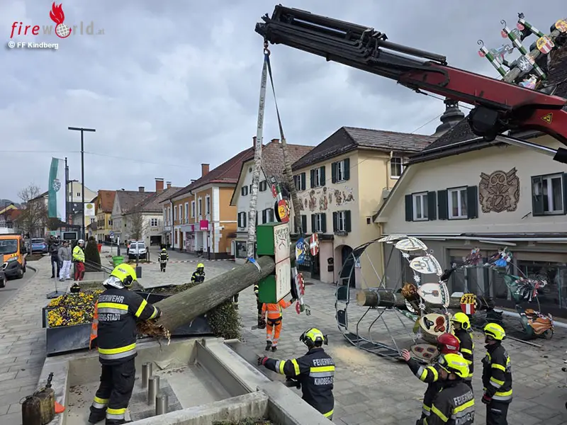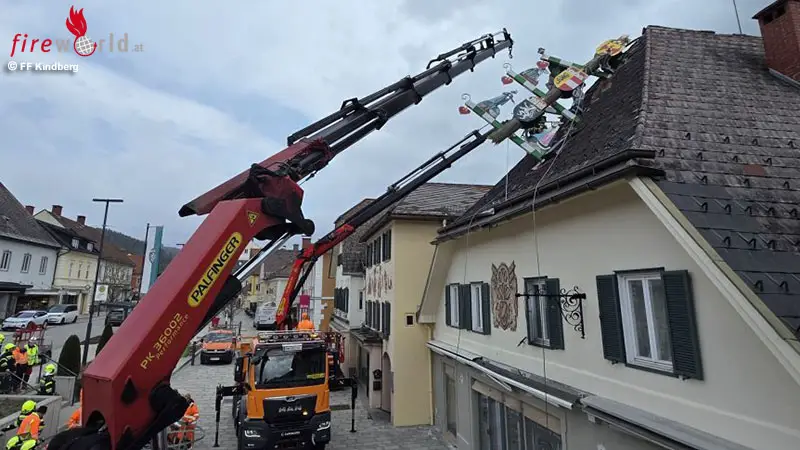 Nach dem großflächigen Absichern der Einsatzstelle wurde gemeinsam mit dem Wirtschaftshof der Stadtgemeinde Kindberg der Teil des Zunftbaumes, der im Hausdach stecken blieb, mittels SRF-Kran und dem Lkw der Stadtgemeinde Kindberg geborgen.