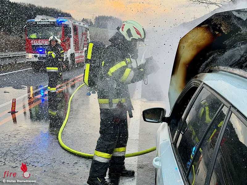 MAUTERN (STMK): Am Freitag, dem 27. März 2026, wurden die Feuerwehren Mautern, Kammern und Seiz um 17:41 Uhr zu einem Fahrzeugbrand auf die A9 Pyhrnautobahn alarmiert. Der Einsatzort befand sich auf der A9 in Fahrtrichtung Slowenien zwischen Mautern und der Raststation Kammern im Baustellenbereich, welcher als Gegenverkehrsbereich geführt wird.