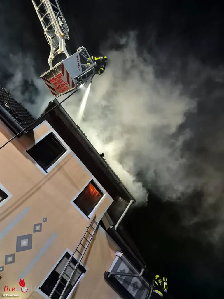 Beim Eintreffen der ersten Einsatzkräfte vor Ort bestätigte sich schließlich dieses Lagebild. Meterhohe Flamen schlugen aus dem Dachstuhl sowie dem Obergeschoss eines Zweifamilienhauses und drohten sich rasch weiter auszubreiten.