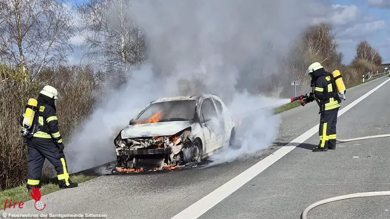 SITTENSEN (DEUTSCHLAND): Auf der Autobahn 1 in Richtung Bremen geriet am Sonntagnachmittag, 29. März 2026, zwischen den Anschlussstellen Sittensen und Elsdorf gegen 14:20 Uhr ein Kleinwagen in Brand.