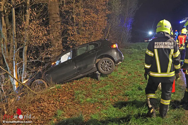 NIEDERNEUKIRCHEN (OÖ): In Niederneukirchen (Bezirk Linz-Land) ist am späten Sonntagabend, 29. März 2026, ein Auto von der Straße abgekommen und gegen Bäume am Waldrand gekracht. Eine Person wurde bei dem Unfall verletzt.
