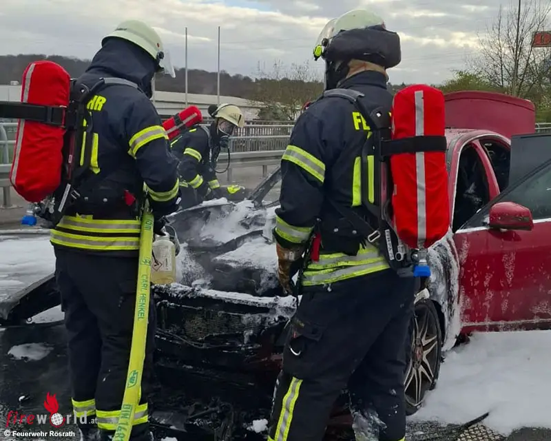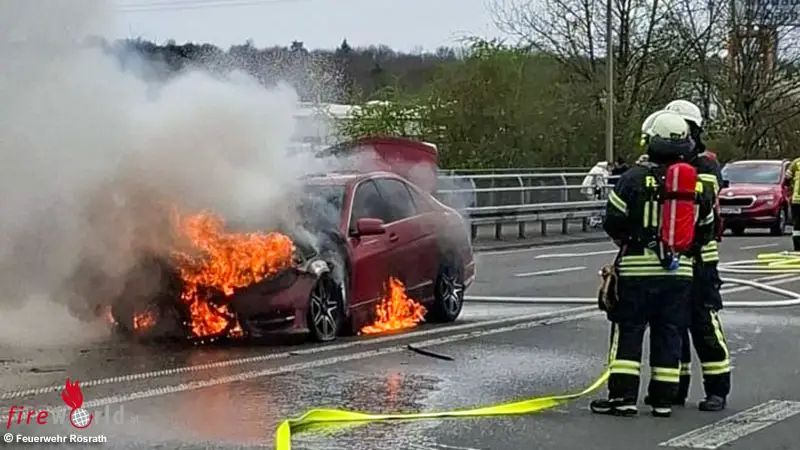 Um 17:00 Uhr wurde ein brennendes Fahrzeug im Bereich der Autobahnabfahrt der BAB 3 gemeldet. Beim Eintreffen der Einsatzkräfte stand der Pkw bereits in Vollbrand.