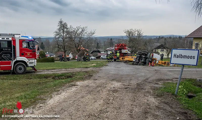 AURACH AM HONGER (OÖ): Im Ortsteil Halbmoos, Gemeinde Aurach am Hongar, kam es am 2. April 2026 zu einem Zwischenfall beim Transport eines Baukrans. Der rund 18 Tonnen schwere Kran kippte im Zuge der Überstellung in abschüssigem Gelände um.