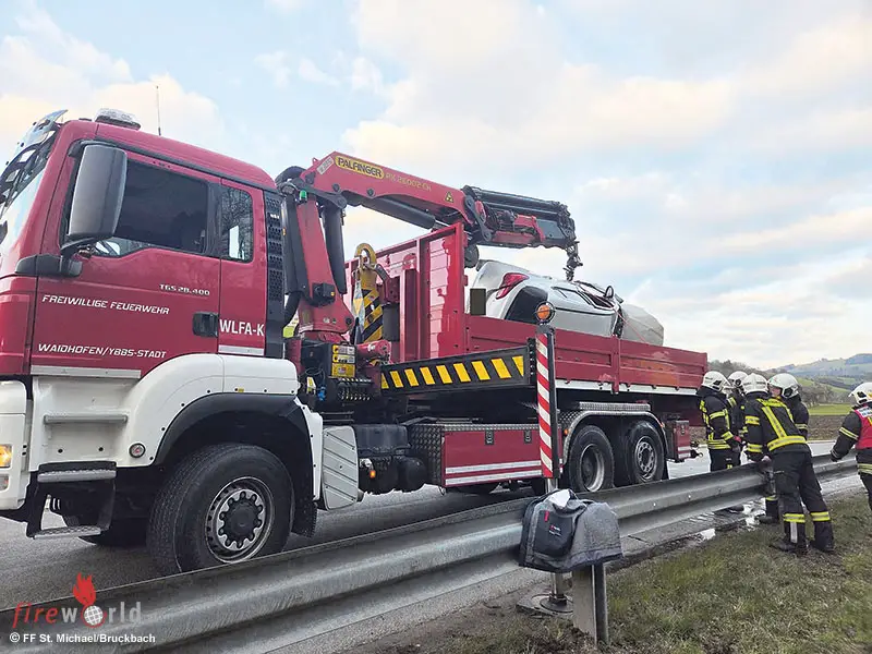 Die Wehr führte die Fahrzeugbergung gemeinsam mit der Feuerwehr Waidhofen/Ybbs-Stadt durch, die mit einem Kranfahrzeug angerückt war.
