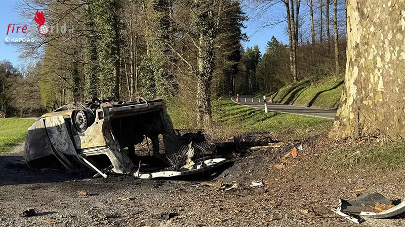 Der Unfall ereignete sich am Dienstag, 7. April 2026, auf der Talstrasse außerhalb von Muri. Ein Augenzeuge meldete der Notrufzentrale um 17.20 Uhr, dass ein Auto gegen einen Baum geprallt sei und nun zu brennen beginne. Minuten später trafen Polizei und Feuerwehr ein und fanden den auf dem Dach liegenden Wagen in Flammen vor. Nachdem der Brand gelöscht wurde, entdeckten die Rettungskräfte im ausgebrannten Wrack eine Person, für die jede Hilfe zu spät kam.