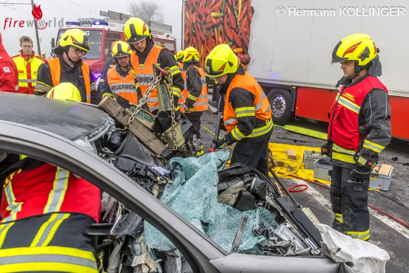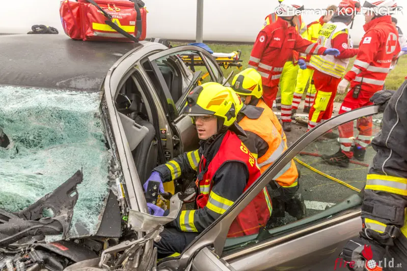 Ein weiterer Ansatz war es somit, per Spreizerketten und Kantholz am Motorbereich die Lenksäule zu bewegen, was dann auch funktionierte und Freiraum in der Fahrgastzelle schuf. Dort hatte man inzwischen von der Beifahrerseite versucht, einen zweiten Rettungsweg zu schaffen und in der Automitte einen Zylinder anzusetzen. Die Lage des Eingeklemmten ließ dies jedoch nicht zu. Schlussendlich konnte nach der Spreizer-Ketten-Methode so viel Freiraum geschaffen werden, dass weitere Klemmungen gelöst und der 19-Jährige aus dem Fahrzeug befreit werden konnte. Leider blieben Reanimationsversuche durch das medizinische Personen (Samariterbund Alkoven, Rotes Kreuz, Notarzt) vergebens. Der Mann starb an der Unfallstelle.