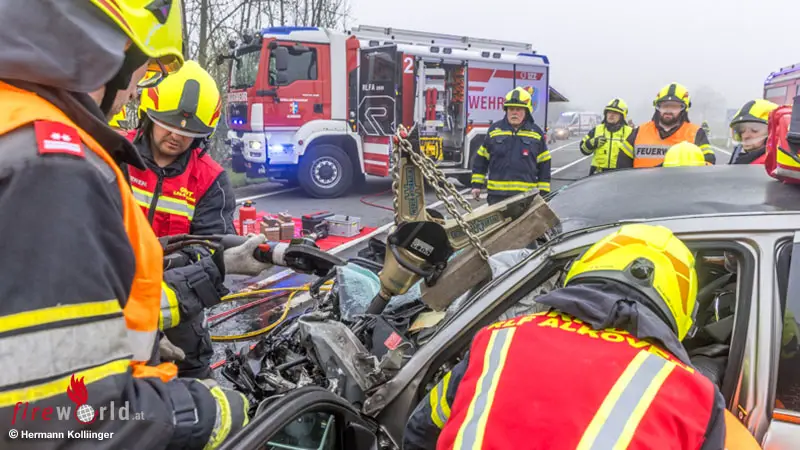 Ein weiterer Ansatz war es somit, per Spreizerketten und Kantholz am Motorbereich die Lenksäule zu bewegen, was dann auch funktionierte und Freiraum in der Fahrgastzelle schuf. Dort hatte man inzwischen von der Beifahrerseite versucht, einen zweiten Rettungsweg zu schaffen und in der Automitte einen Zylinder anzusetzen. Die Lage des Eingeklemmten ließ dies jedoch nicht zu. Schlussendlich konnte nach der Spreizer-Ketten-Methode so viel Freiraum geschaffen werden, dass weitere Klemmungen gelöst und der 19-Jährige aus dem Fahrzeug befreit werden konnte. Leider blieben Reanimationsversuche durch das medizinische Personen (Samariterbund Alkoven, Rotes Kreuz, Notarzt) vergebens. Der Mann starb an der Unfallstelle.