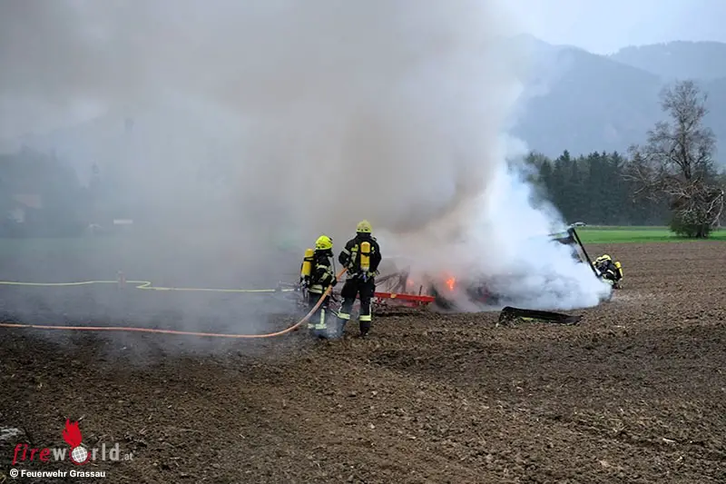 Noch während der laufenden Maßnahmen an der Unfallstelle erfolgte um 10:35 Uhr eine weitere Alarmierung zu einem Brand mit dem Einsatzstichwort „B3 – Brand landwirtschaftliche Maschine“. Ein Teil der eingesetzten Kräfte verblieb zur Absicherung und zum Brandschutz an der Unfallstelle, während zwei Fahrzeuge aus Grassau in den Erlenweg abrückten. Zusätzlich wurde ein Löschfahrzeug aus Staudach-Egerndach nachalarmiert.