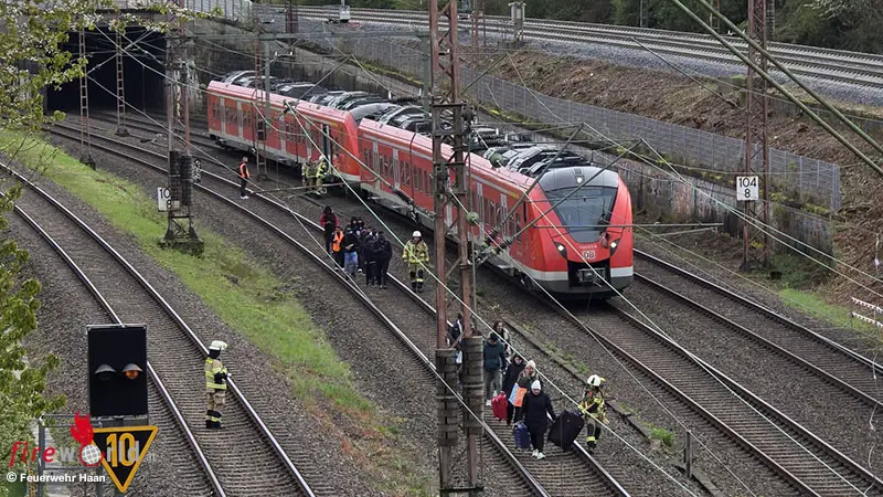 HAAN (DEUTSCHLAND): Nach einem Schaden an einer Oberleitung hat die Feuerwehr Haan am Morgen des 12. April 2026 auf freier Strecke in Gruiten 65 Gäste aus einer S-Bahn zu einem bereitgestellten Bus an der Ostspange geführt.