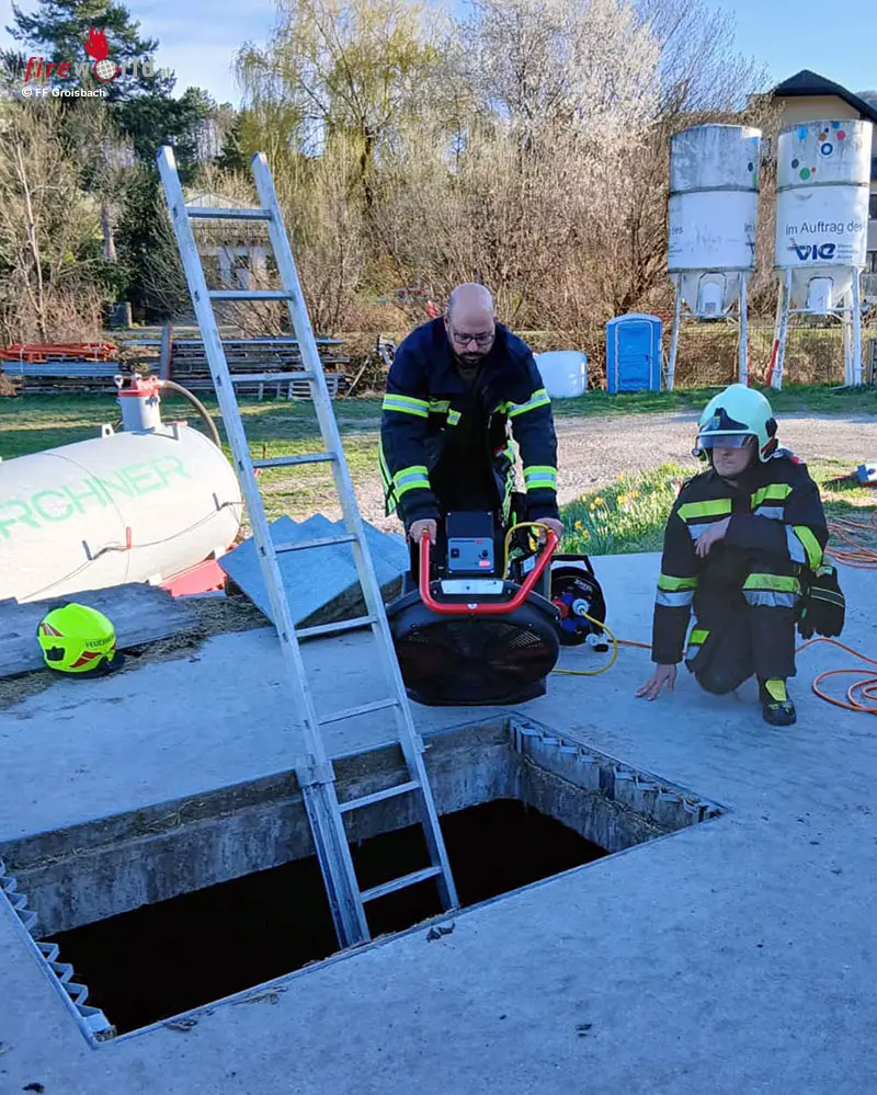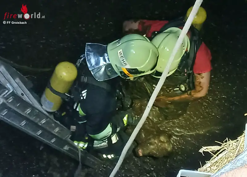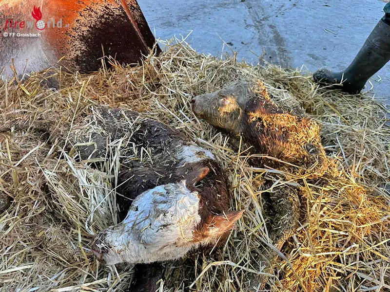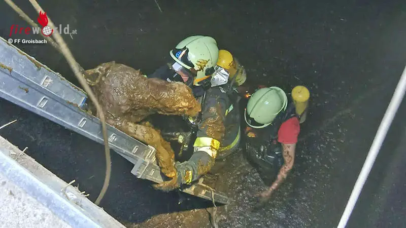 ALLAND (NÖ): Die Freiwillige Feuerwehr Groisbach (Gemeinde Alland) Bezirk Baden wurde am 8. April 2026 zu einem Tierrettungseinsatz alarmiert. Zwei ganz frisch geborene Kälber waren in eine Güllegrube gestürzt.
