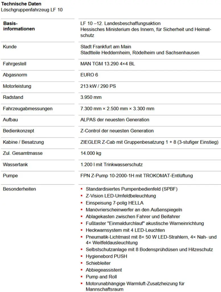FRANKFURT (DEUTSCHLAND): Die Albert Ziegler GmbH hat laut Mitteilung von April 2026 drei baugleiche Löschgruppenfahrzeuge LF 10 an die Feuerwehr Frankfurt ausgeliefert. Die Fahrzeuge wurden im Rahmen der 12. Landesbeschaffungsaktion des Hessischen Ministeriums des Innern, für Sicherheit und Heimatschutz beschafft und verstärken künftig die Freiwilligen Feuerwehren in den Stadtteilen Heddernheim, Rödelheim und Sachsenhausen.