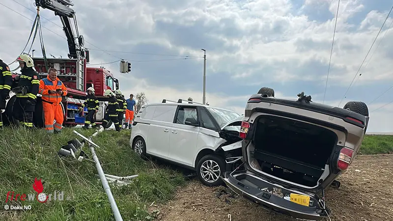 Durch die Wucht des Zusammenstoßes wurden beide Fahrzeuge in den angrenzenden Straßengraben geschleudert. Der Pkw kam dabei auf dem Dach zu liegen.