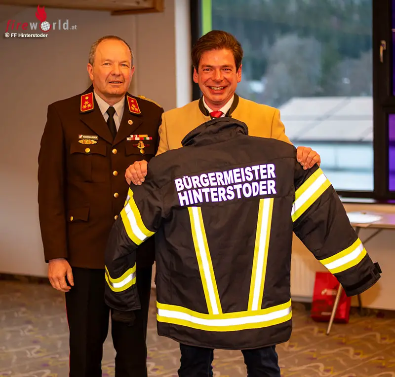 Als Zeichen des Dankes durfte die Feuerwehr den beiden Ehrengästen besondere Präsente überreichen: Helmut Berc erhielt ein kunstvolles Korpsabzeichen aus Holz. Bürgermeister Klaus Aitzetmüller wurde mit einer funktionellen Einsatzjacke ausgestattet, damit er bei künftigen Großeinsätzen am Einsatzort nicht nur bestens geschützt, sondern für alle Beteiligten auch sofort als Verantwortlicher erkennbar ist.