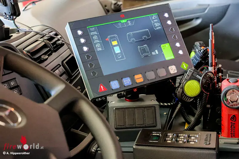 Auch in der Mannschaftskabine ist jeder Sitzplatz mit einem 3-Punkt-Sicherheitsgurt ausgestattet, ein Hygieneboard ermöglicht erste Reinigungs- und Desinfektionsmaßnahmen direkt am Einsatzort.