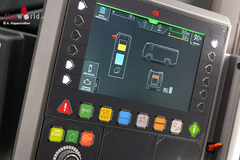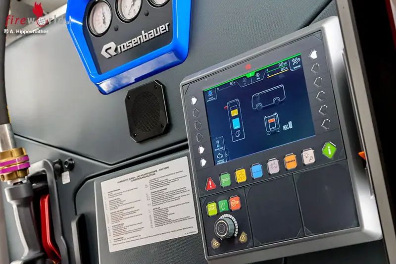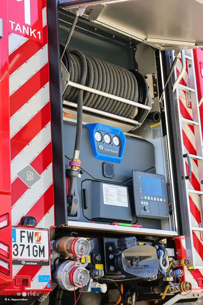 Zur Förderung des Löschwassers ist im Heck eine Rosenbauer Feuerlöschpumpe NH35 verbaut. Diese ist über die höhenverstellbare Bedieneinheit intuitiv zu steuern, ein automatischer Pumpendruckregler erleichtert die Arbeit des Maschinisten.
