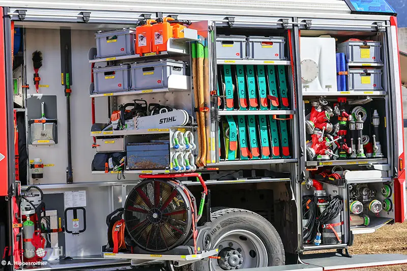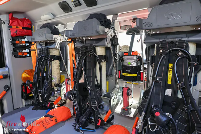 Gleich drei Atemschutzgeräte sowie ein Erkundungsgerät in Überdrucktechnik werden im Mannschaftsraum bzw. in der Fahrerkabine mitgeführt, ein vollständiges Ausrüsten während der Anfahrt ermöglicht schnelles Handeln beim Eintreffen. Mittlerweile unabdingbare Zusatzausstattungen wie Fluchtfilterhauben, Wärmebildkamera, ein mobiler Rauchabschluss sowie ein elektrischer Hochleistungslüfter stehen ebenfalls bereit. Für die Personenrettung sind neben Absturzsicherungen ein komplettes Notrettungsset sowie eine Schleifkorbtrage (samt Radsatz) mit an Bord.