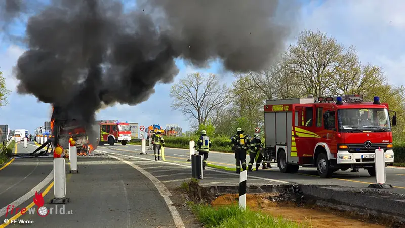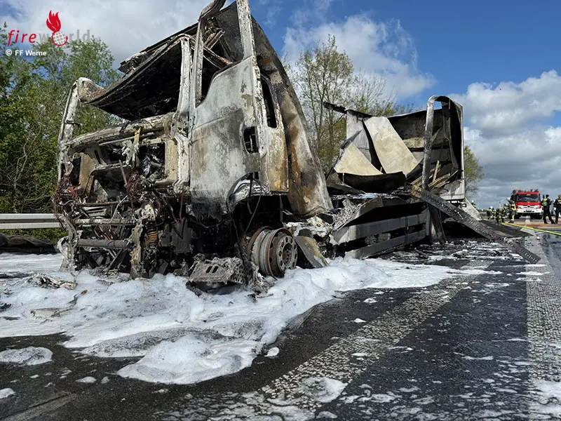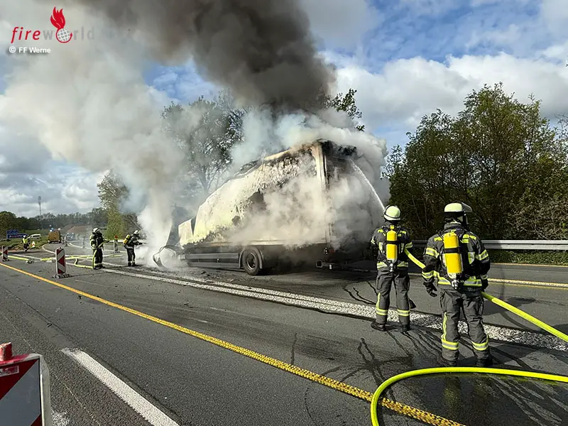 WERNE (DEUTSCHLAND): Am Montagmorgen, 20. April 2026, wurde der Löschzug Mitte der Freiwilligen Feuerwehr Werne um 09:29 Uhr mit dem Alarmstichwort „F2 Fahrzeugbrand – Lkw“ auf die Bundesautobahn 1 in Fahrtrichtung Köln, Höhe der Anschlussstelle Hamm/Bergkamen, alarmiert.