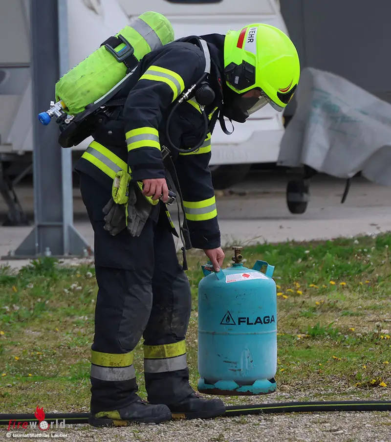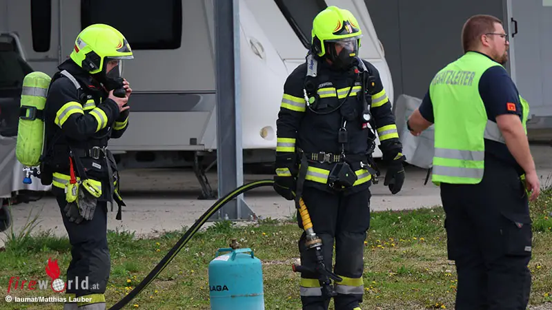 Die Kräfte wurden direkt vom Einsatzort zu einem Gasaustritt – ausströmendes Gas aus einer Propangasflasche – zu einem Autohaus im Gemeindegebiet alarmiert. Beim Eintreffen an der genannten Einsatzörtlichkeit stellte sich dann heraus, dass der Einsatz im unmittelbaren Nahbereich bei einem Abstellplatz für Wohnwägen beziehungsweise Wohnwagenanhänger war.