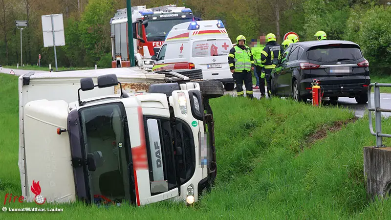 Ein LKW ist Dienstagvormittag auf der L563 Traunuferstraße, Bergernstraße, in Weißkirchen an der Traun vor dem dortigen Kreisverkehr von der Straße abgekommen und über die Böschung in eine Wiese – beziehungsweise ein Rückhaltebecken gestürzt. Die Einsatzkräfte der Feuerwehr und die Rettung wurden zur Personenrettung nach einem Verkehrsunfall mit Lkw alarmiert.