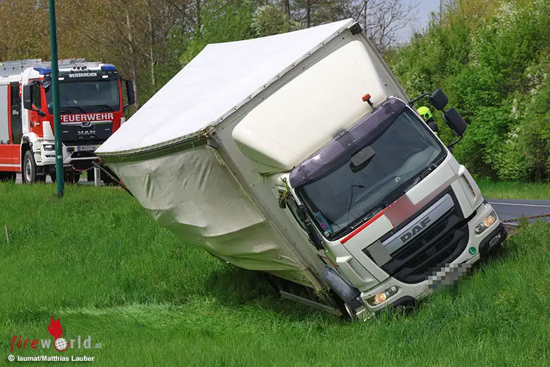 WEISSKIRCHEN AN DER TRAUN (OÖ): In Weißkirchen an der Traun (Bezirk Wels-Land) ist am Dienstagvormittag, 21. April 2026, ein Lkw von der Fahrbahn abgekommen und in die Wiese unterhalb der Straßenböschung gestürzt.