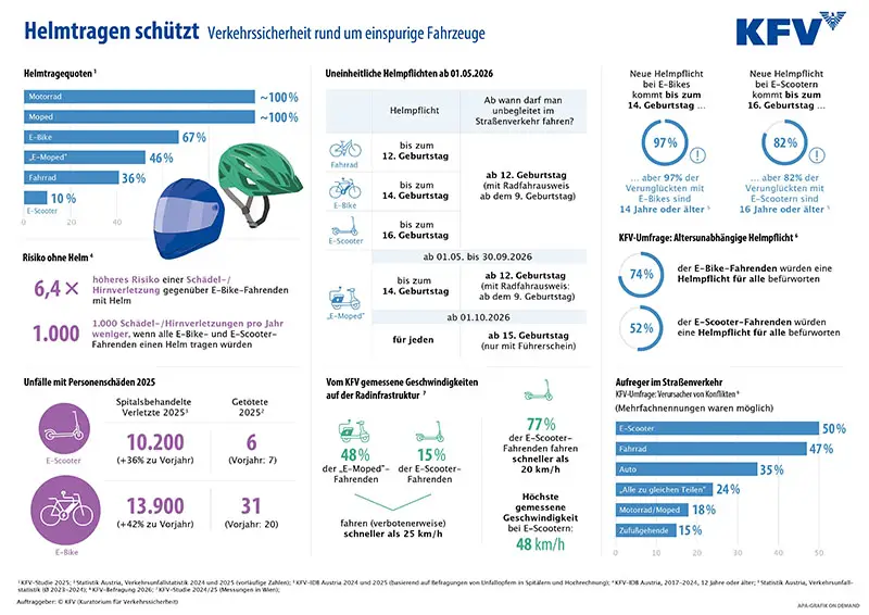 „Anders als von uns empfohlen, sieht die 36. StVO-Novelle leider keine altersunabhängige Helmpflicht bei E-Bikes und E-Scootern vor“, betont Mag. Christian Schimanofsky, Direktor vom Kuratorium für Verkehrssicherheit (KFV) in einer Aussendung vom 21. April 2026. „Wir müssen jetzt noch mehr Kraft in die Bewusstseinsbildung investieren, damit auch möglichst viele Erwachsene freiwillig einen Helm tragen. Dadurch wollen wir so viele schwere und tödliche Kopfverletzungen wie nur irgendwie möglich verhindern“, so Mag. Schimanofsky.